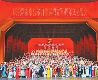 9月24日晚,庆祝新疆维吾尔自治区成立70周年文艺晚会《美丽新疆》在乌鲁木齐文化中心大剧院举行。 |