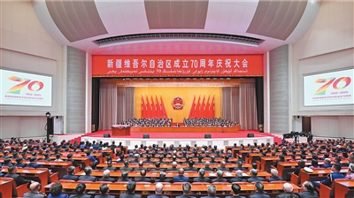 9月25日上午,新疆维吾尔自治区成立70周年庆祝大会在新疆人民会堂隆重举行。中共中央总书记、国家主席、中央军委主席习近平出席庆祝大会。王沪宁、蔡奇出席大会。 |